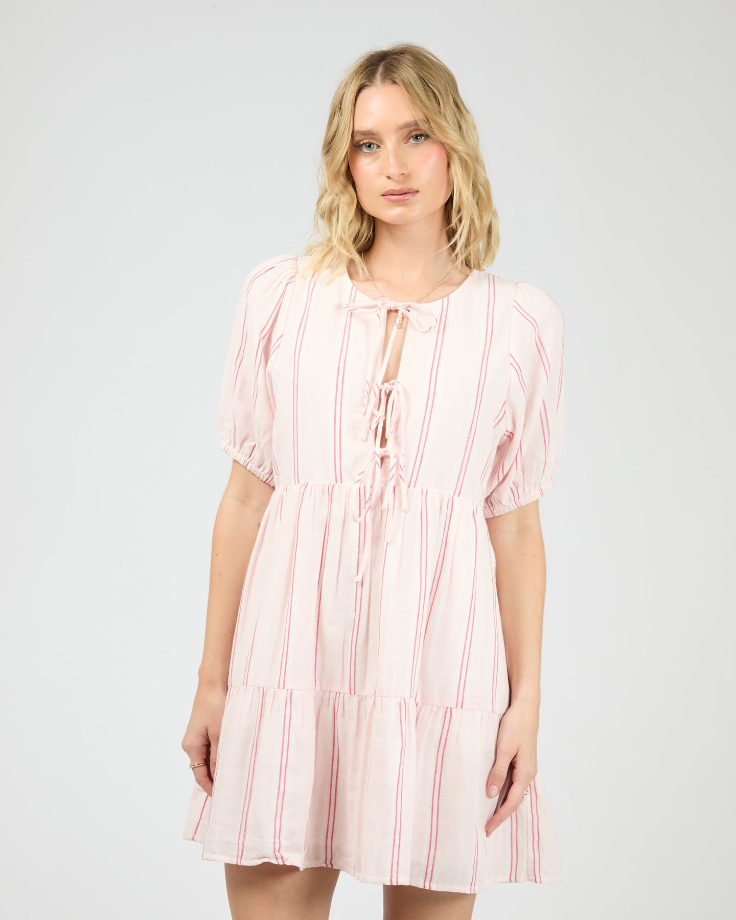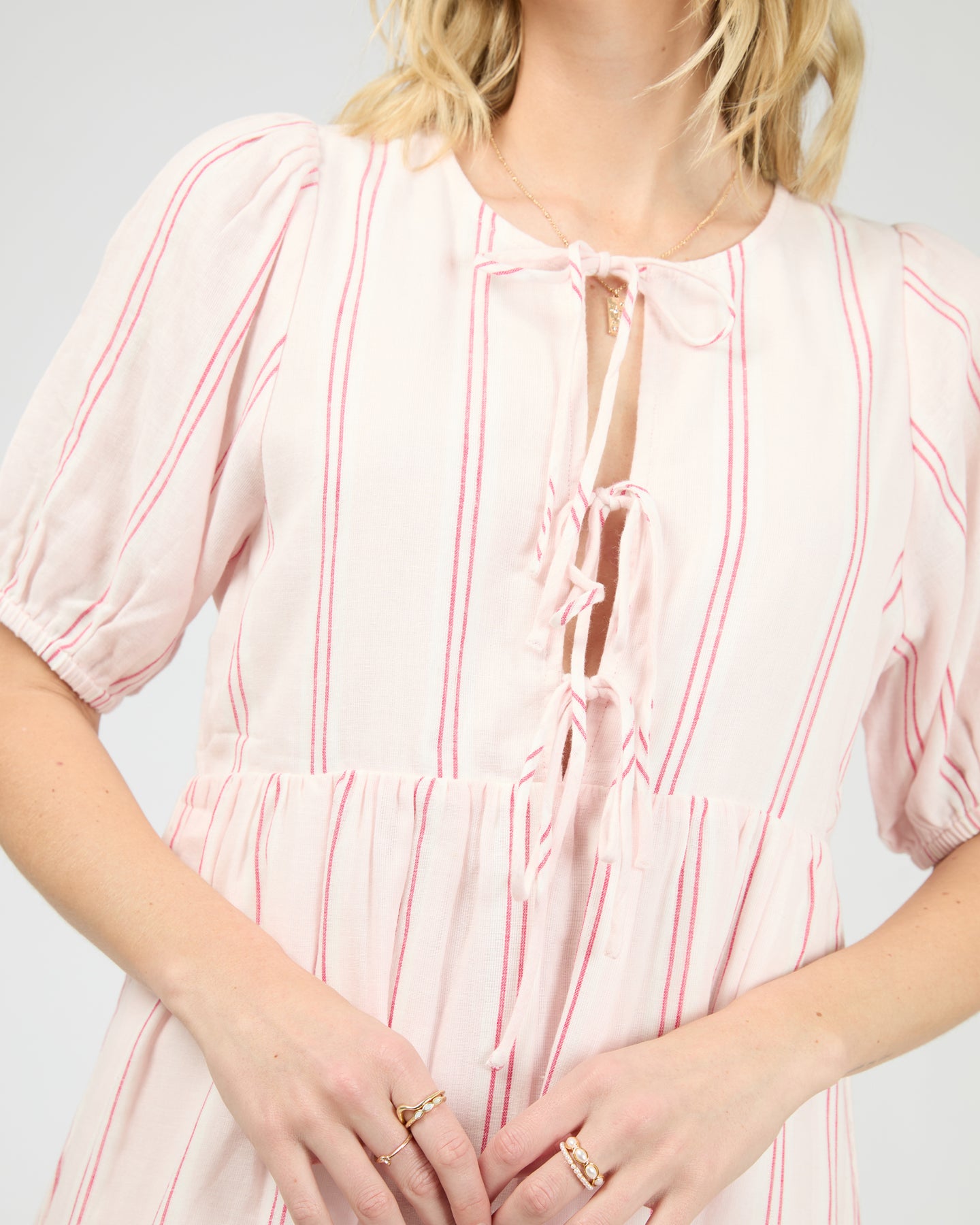 The Blythe Mini Dress is playful and feminine, featuring a soft pink stripe pattern and a tiered skirt that moves with ease. Three delicate rouleau ties at the front and puff sleeves add sweet vintage-inspired charm. Style it with sandals or wedges for an effortlessly cute spring look.