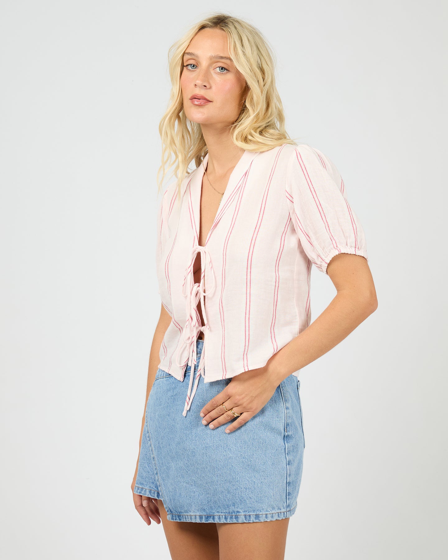 The Blythe Top blends timeless charm with modern details, featuring soft stripes, a subtle collar, and delicate puff sleeves that add a touch of romantic elegance. Two front ties provide a playful, feminine touch while allowing you to adjust the fit and style to your liking. Crafted for versatile wear, it pairs beautifully with jeans for casual outings or a flowing maxi skirt for an effortlessly polished and chic look, perfect for any season or occasion.