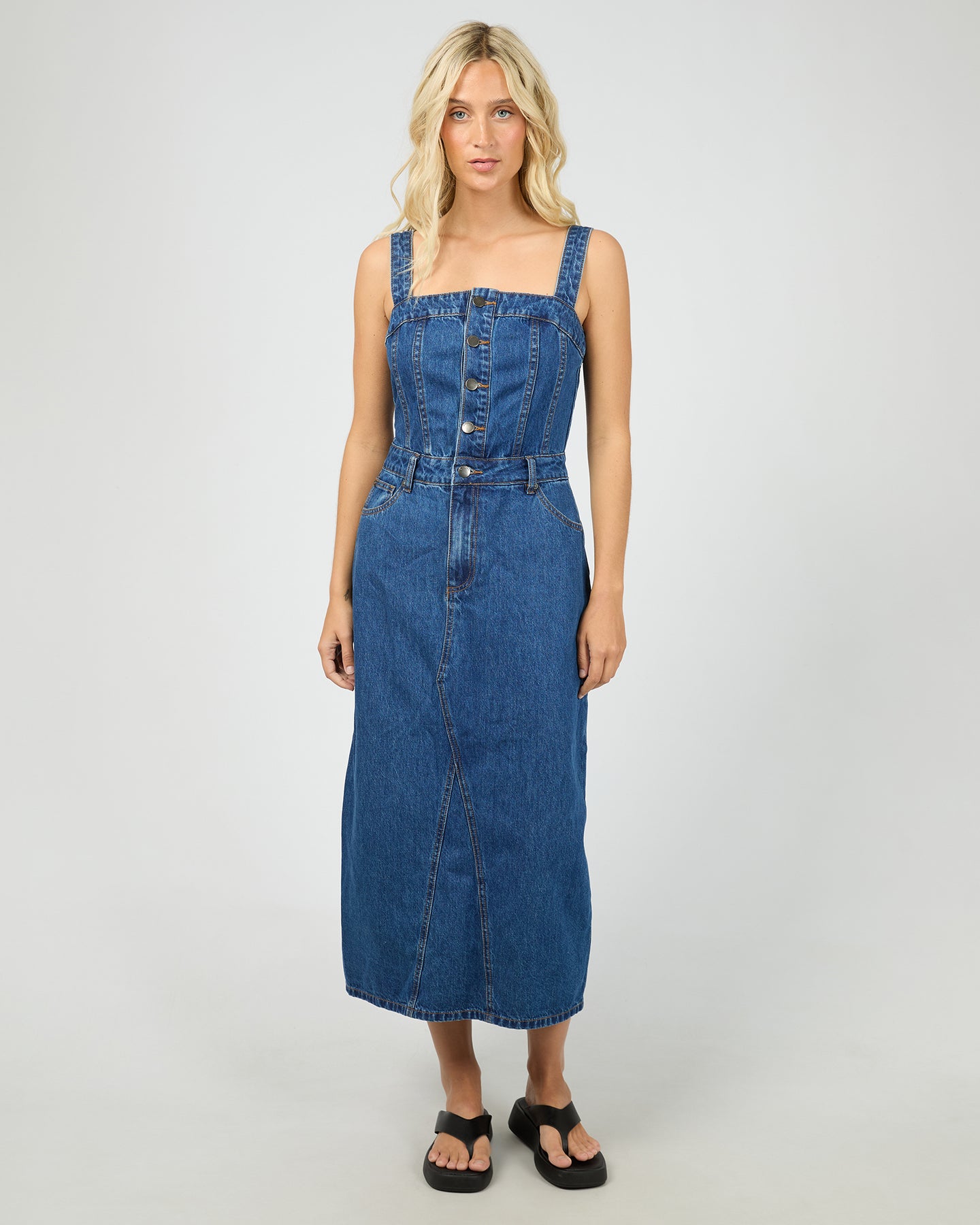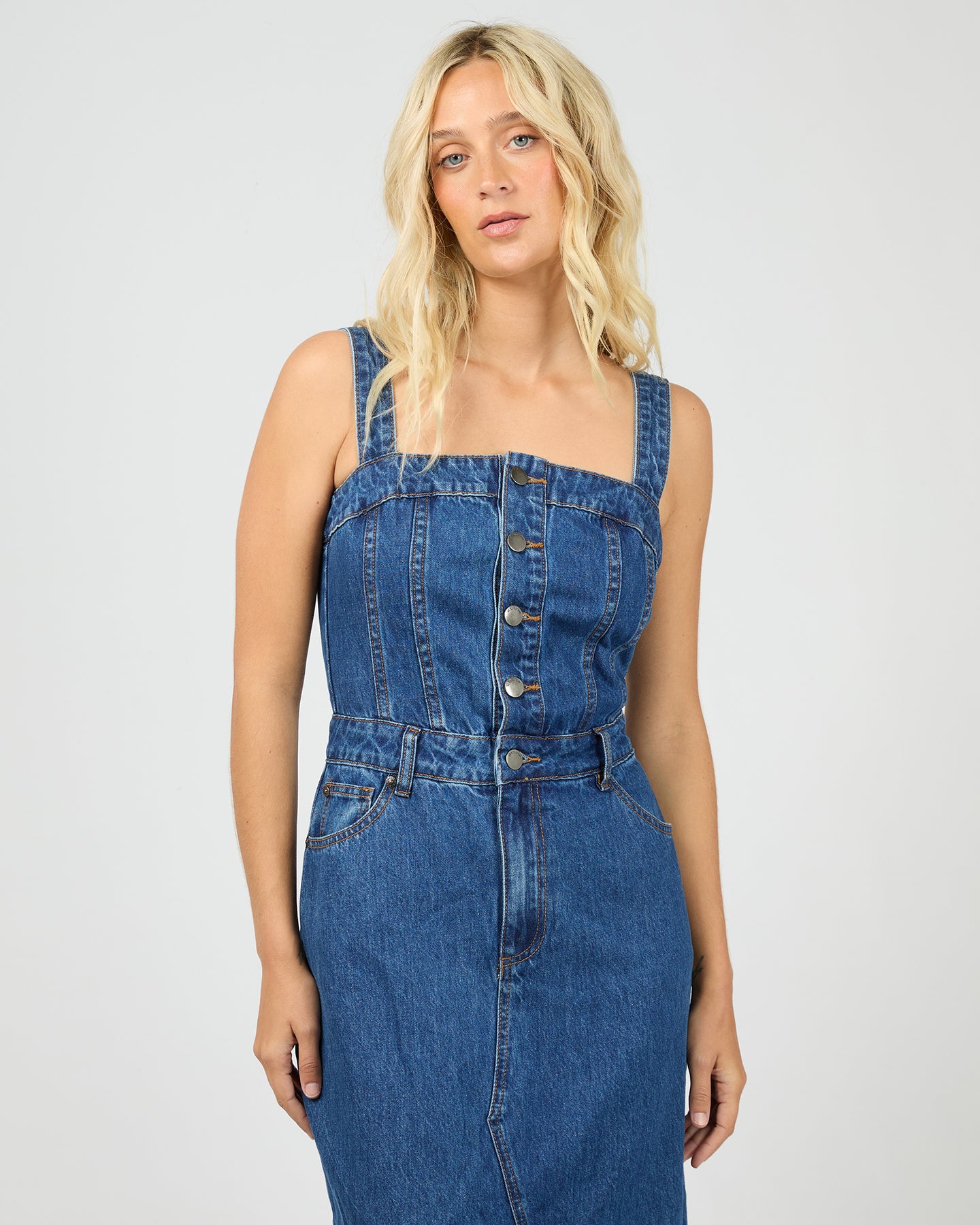 Discover timeless elegance with our Coco Midi Dress, where classic denim meets modern design. Crafted from our All About Eve signature denim, this dress features a button up corset top half look with a flattering midi skirt bottom. The vintage wash denim with contrast stitching adds a casual yet chic vibe.