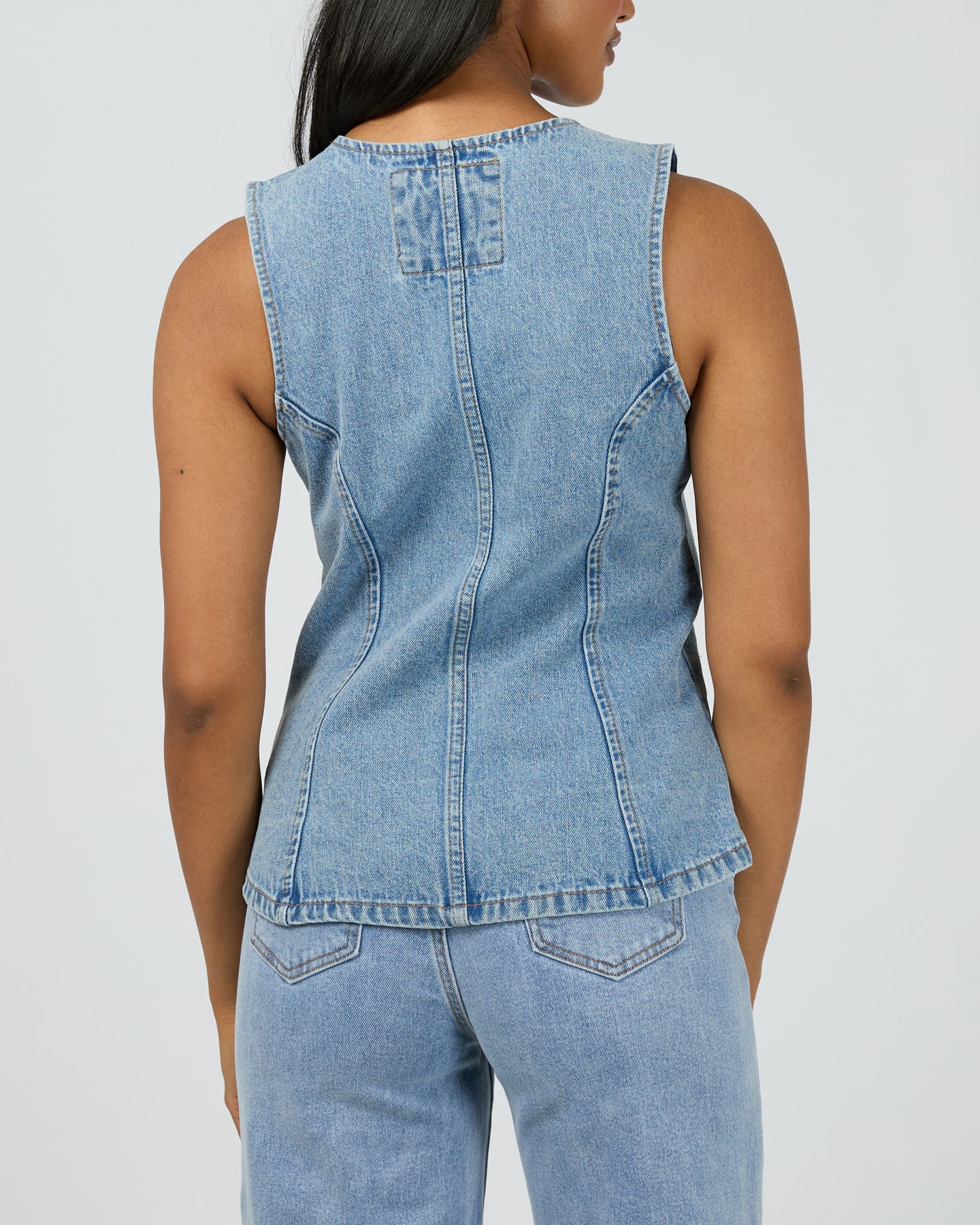 The Lena Denim Vest features a classic button-down front and a stylish split hemline at the torso, offering both comfort and a flattering fit. This versatile piece is perfect for layering, adding a timeless touch to your casual wardrobe while allowing ease of movement throughout your day.