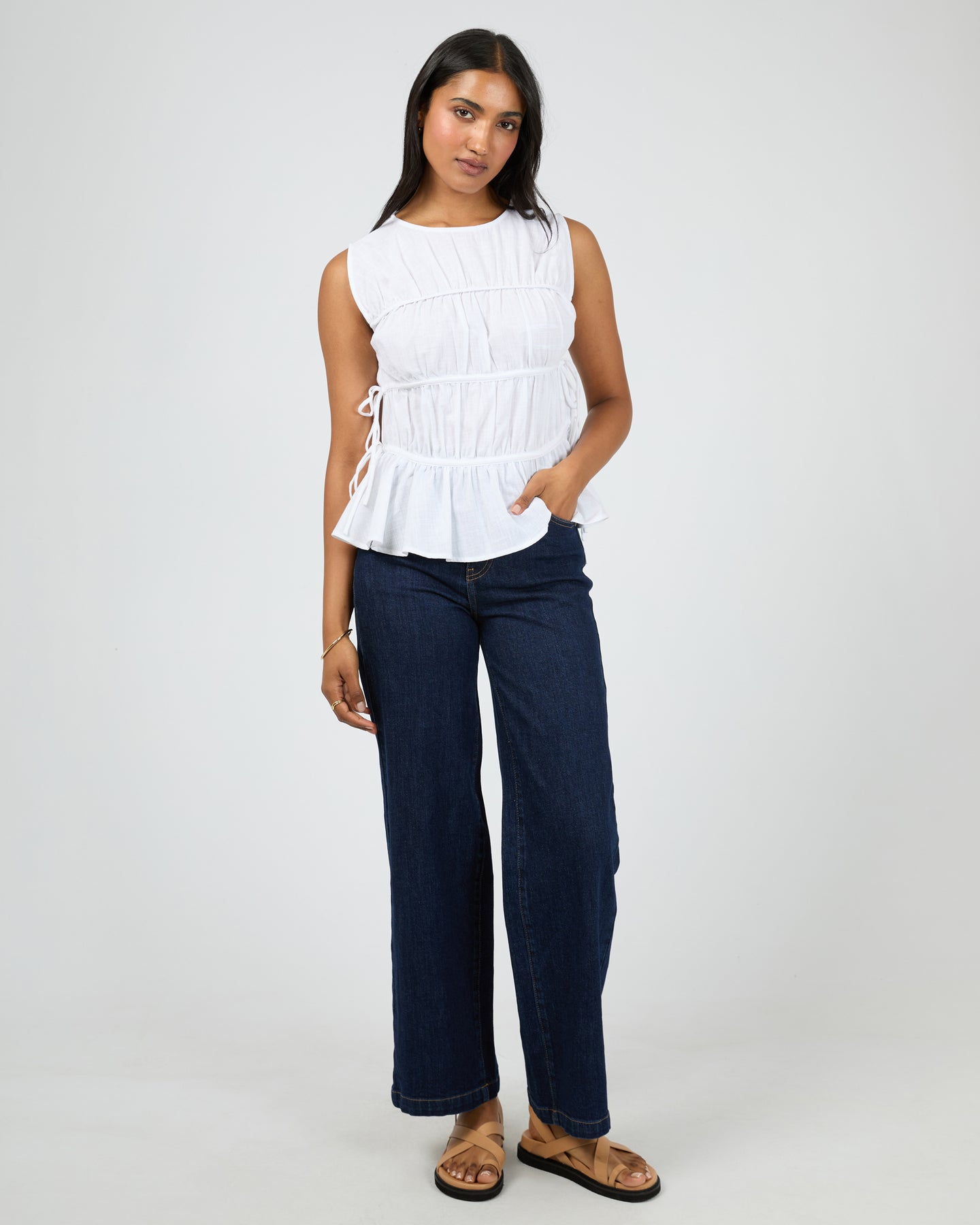 The Lou Lou Tie Top in White features a stylish tie closure and ruched fabric that flatters your silhouette. Its adjustable tie design ensures a comfortable, personalized fit, while the ruched detailing adds texture and charm. Perfect for layering or wearing on its own, this top combines comfort with a chic, versatile look.