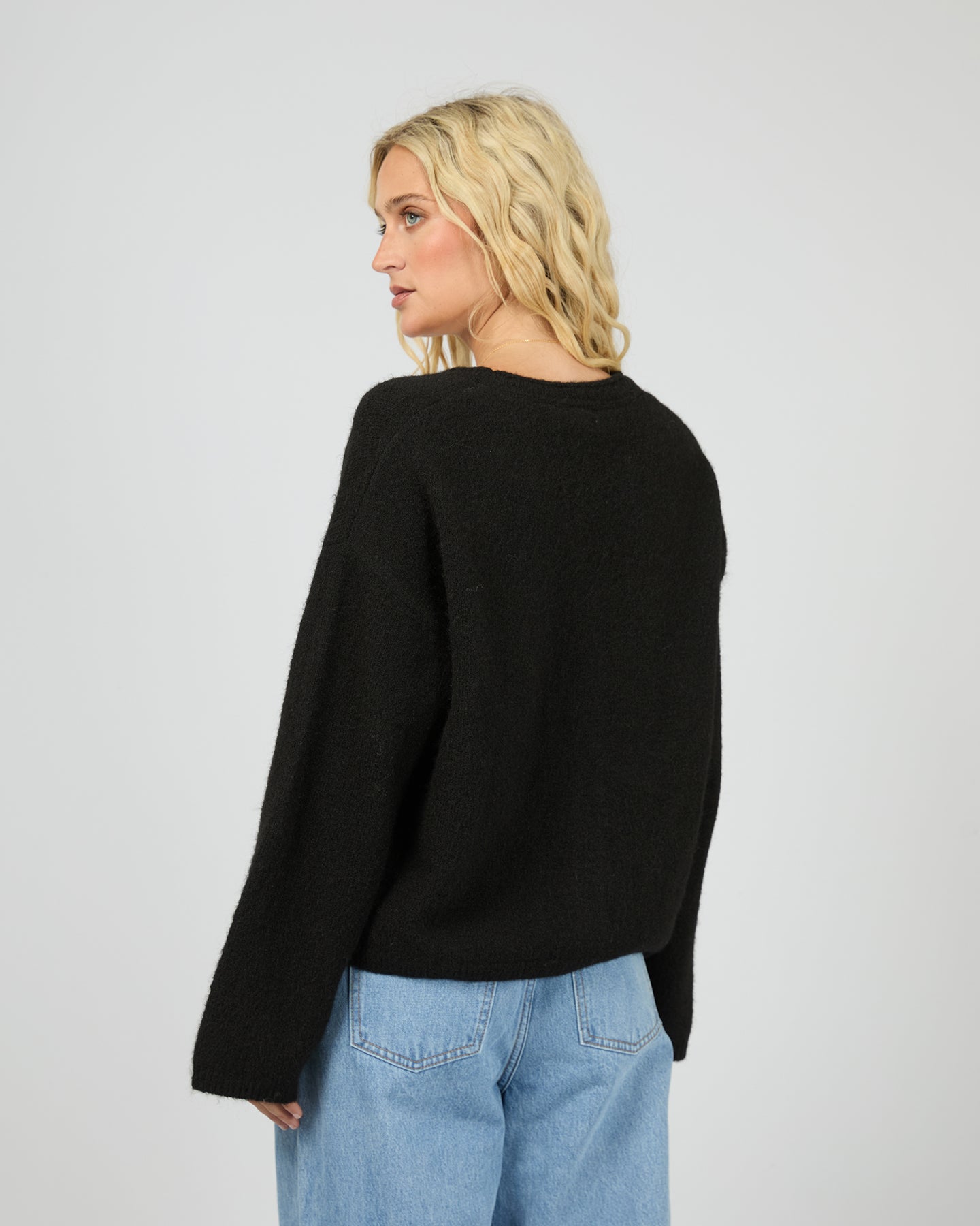 A considered essential, the Nova Cardigan in Black is a timeless layering essential with a relaxed, easy silhouette. Crafted from a soft, textured knit made with recycled polyester, it offers warmth and comfort without feeling heavy. Functional front buttons allow for versatile styling, whether worn buttoned up as a top or layered open over basics. The classic black colourway makes it endlessly wearable, pairing effortlessly with denim, tailored trousers, or dresses for everyday, season-spanning style.