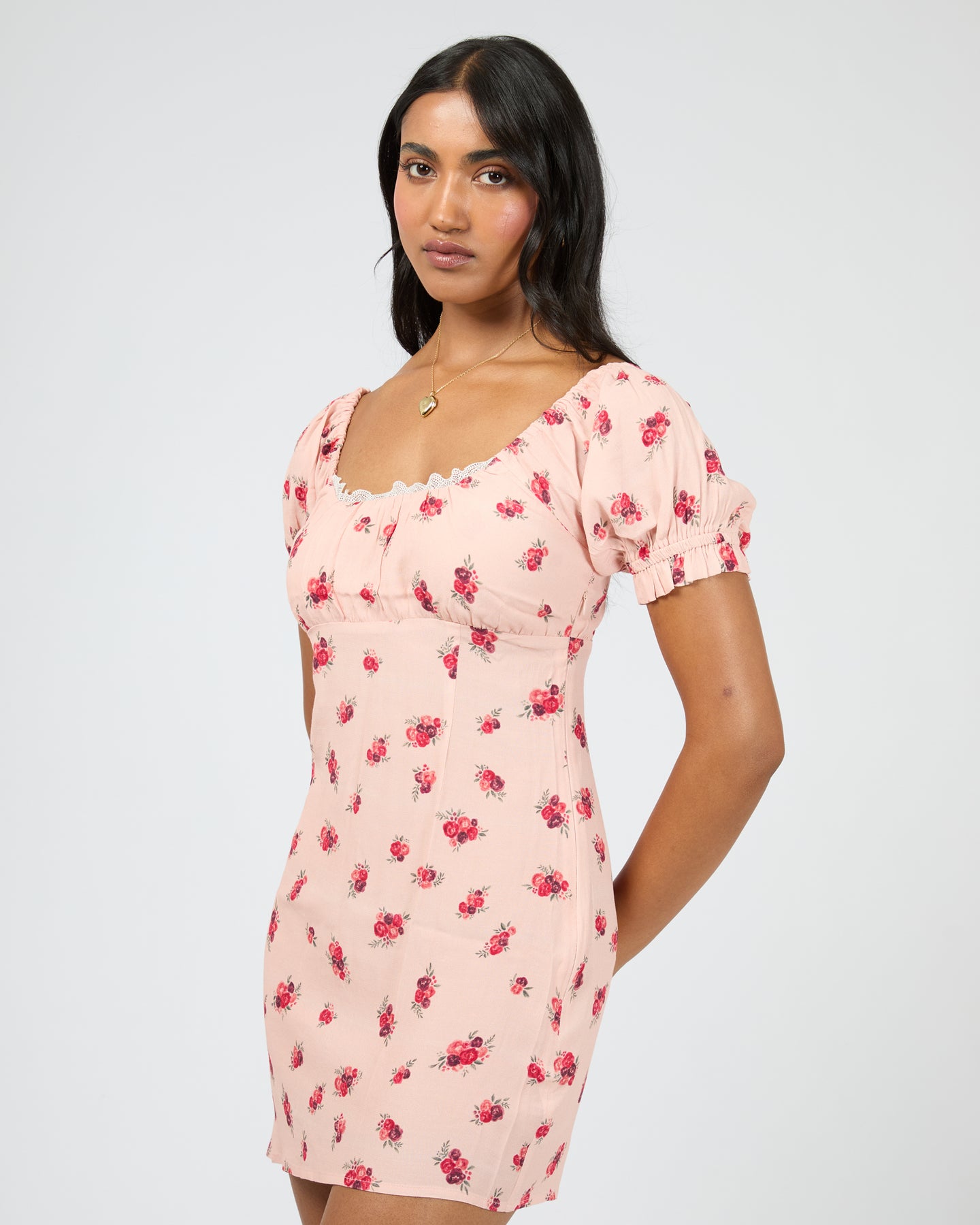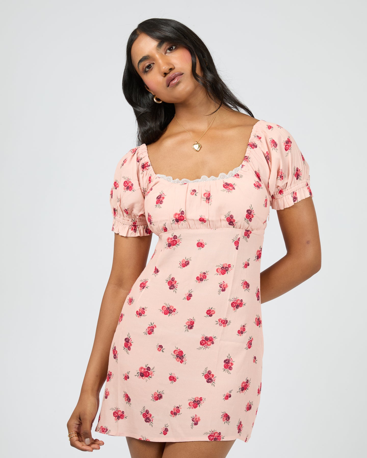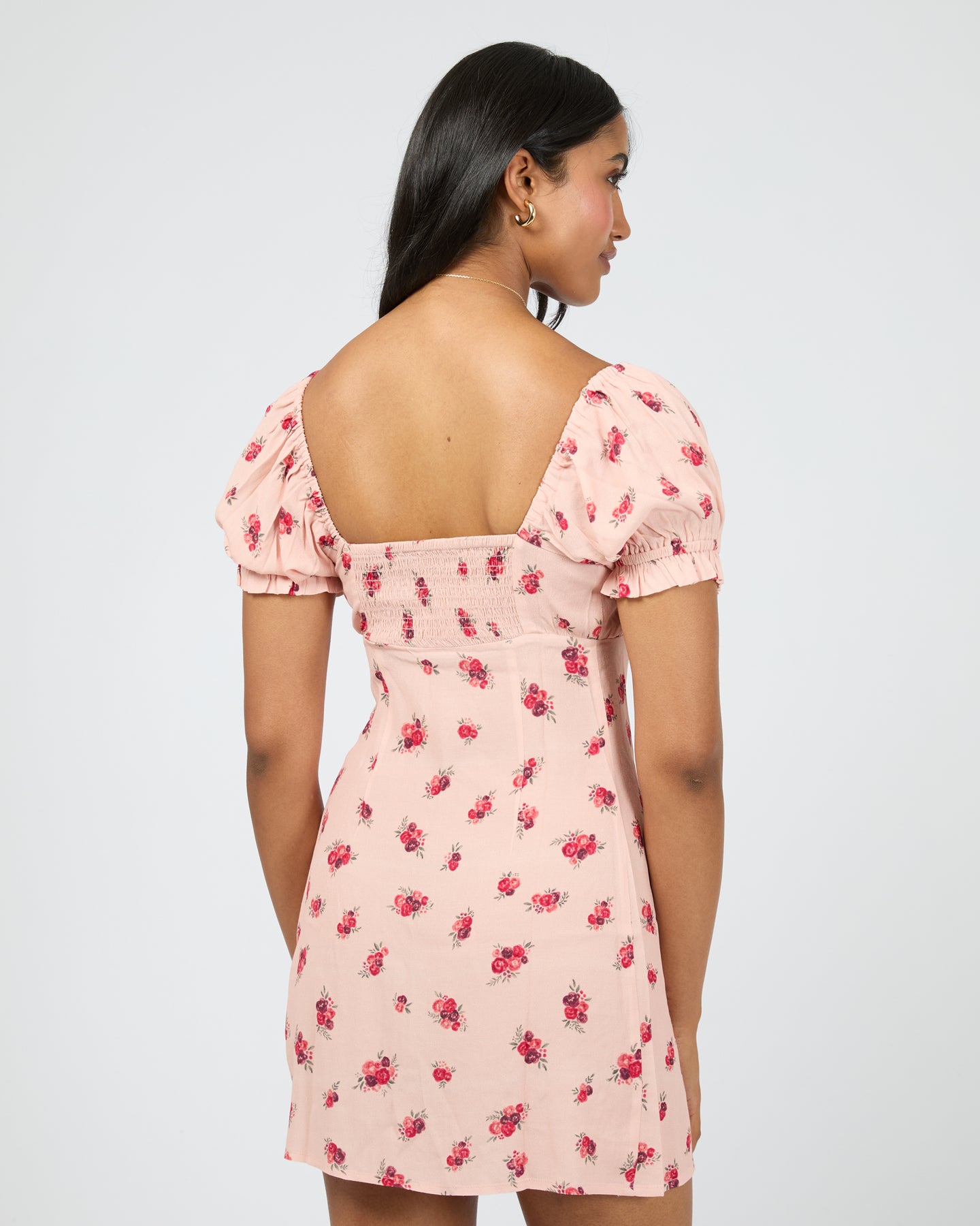 Designed for ease and comfort the Scarlett Mini Dress is a feminine summer staple, it features elasticated shoulders and cuffs with subtle gathers that shape the bust and waist. Elevated by a romantic rose print on a pale pink base, this All About Eve exclusive yardage is an eye-catching piece. A lace-trim neckline and delicate frill at the sleeves bring a romantic touch, while the shirred back panel ensures a flattering fit.