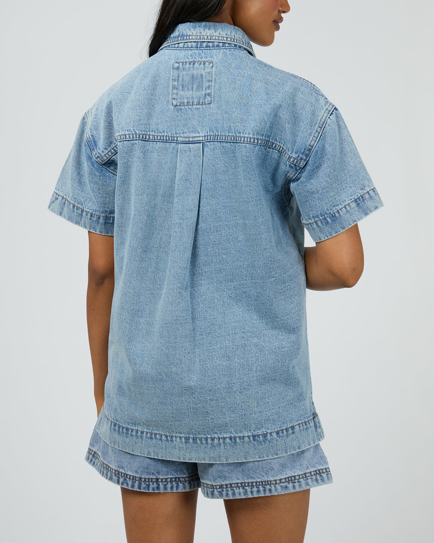 The Simi Denim Shirt features a classic button-down design with a collared neckline and two front pockets for added convenience. Its short sleeves make it perfect for warmer days, offering both comfort and style. A versatile wardrobe staple, it pairs effortlessly with casual or smart-casual outfits.