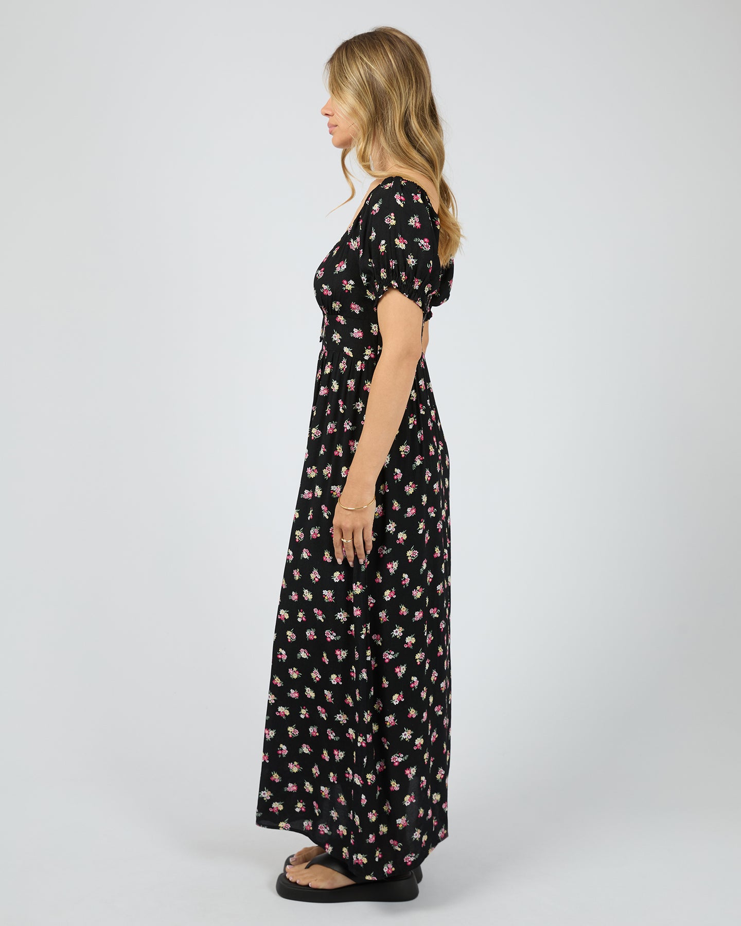 The Vienna Maxi Dress exudes timeless romance, featuring a flowing black silhouette adorned with a soft ditsy pink floral print. Designed with subtle feminine details and a flattering fit, it’s perfect for golden hour strolls or garden parties. Pair it with espadrilles for an effortlessly elegant spring look with a touch of European charm.