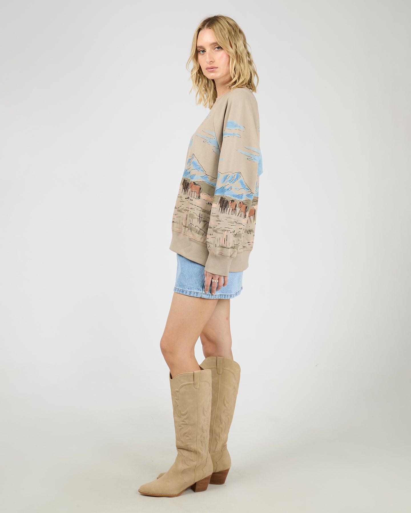 With a vintage-style wild horses illustration on a soft stone background, this boxy raglan crew channels untamed spirit and laid-back cool. Its relaxed fit and lived-in feel make it perfect for pairing with denim cut-offs or slouchy pants for that effortlessly rugged, road trip-ready vibe.
